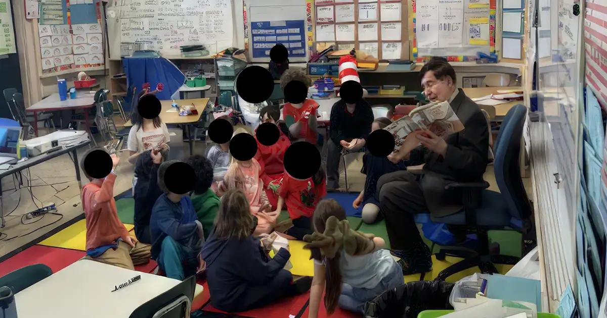 An image released by the school showed a collage of images from Read Across America Day, which included the image above. The image shows Monfredo, reading to children inside the Midland Street School, on Friday, March 1.